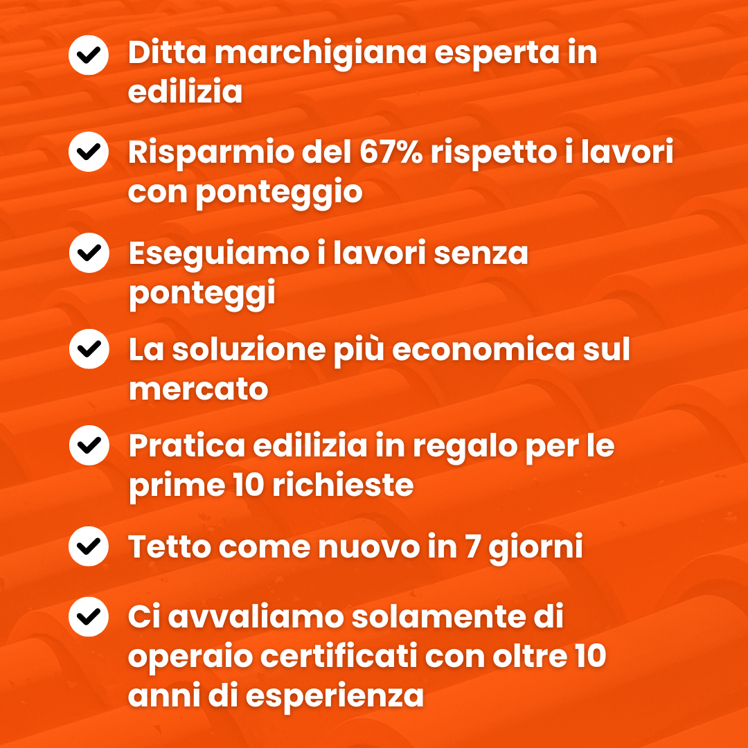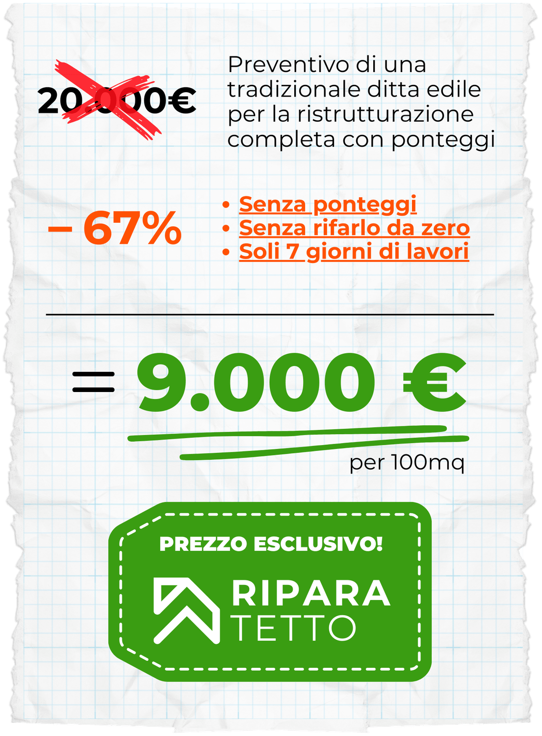 Oggi invece, grazie al nostro metodo, puoi RISPARMIARE oltre 20.000€ rispetto i metodi di ristrutturazione completa del tetto, con meno problemi e intralci poiché il nostro metodo NON prevede impalcature e ponteggi.